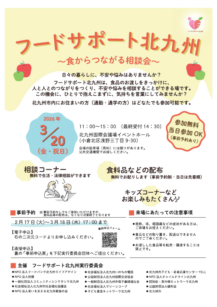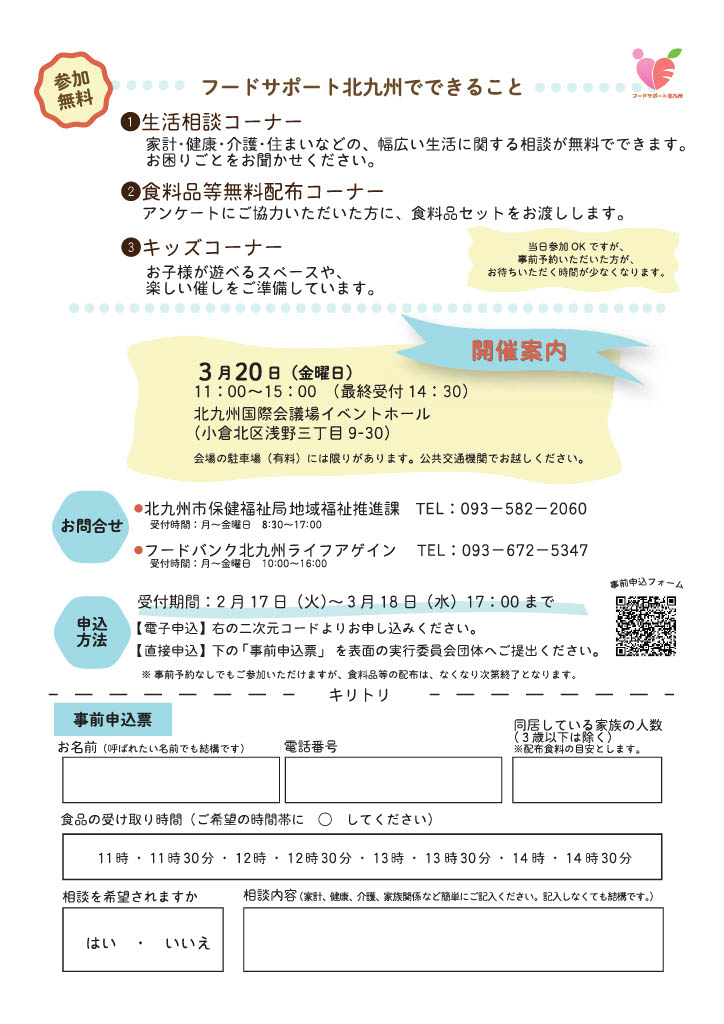 【事前申込フォーム】第2回フードサポート北九州事前申込フォーム(外部リンク)よりお申し込みください。