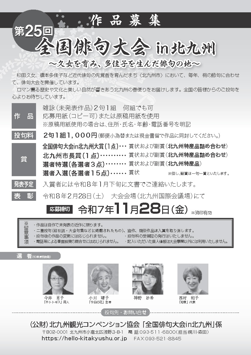 杉田久女、橋本多佳子など近代俳句の先駆者を育んだまち・北九州市は、毎年、全国俳句大会を開催しています。